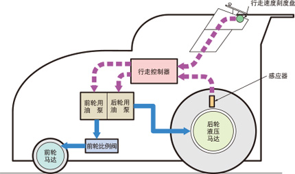 本系統(tǒng)起到了防止打滑和流暢起動的效果。由于能夠控制反饋速度,因此使夠使因負載變動而尋致的速度變化大幅減小。并在強大的牽引力作用下,實現了行走的穩(wěn)定性。
