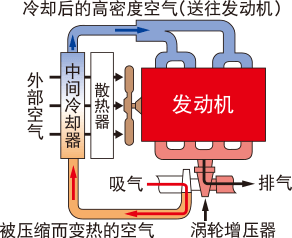 吸入的空氣在渦輪加載器的壓縮下形成高溫,經(jīng)中間冷卻器冷卻后可提高吸入效率。在大幅度減少NOx和PM的同時(shí),提高了輸出功率,減少了油耗。