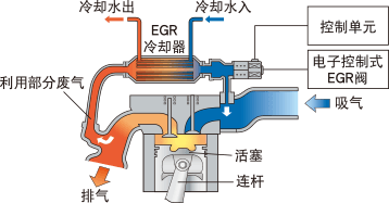 采用冷卻式EGR系統(tǒng),獲得進(jìn)一步減少NOx(氮氧化合物)的效果。其做法是在對(duì)排放的氣體再循環(huán)以降低燃燒溫度的EGR(Exhaust Gas Recircu-lation)上設(shè)置水冷式冷卻器。