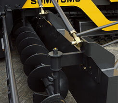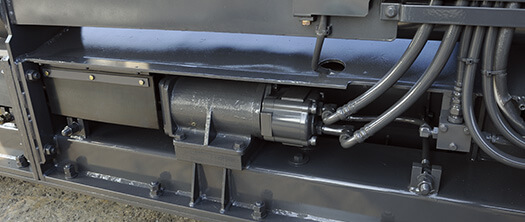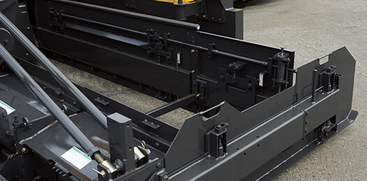 標(biāo)準(zhǔn)配置了與后部熨平板連動(dòng)的伸縮式流量調(diào)節(jié)板。防止后部熨平板前的成品材多余擁有量。另外,對(duì)熨平板末端的成品材輸送也能流暢地進(jìn)行。而且,流量調(diào)節(jié)板的升降,可以用1把棘輪扳手從側(cè)面輕易地進(jìn)行。