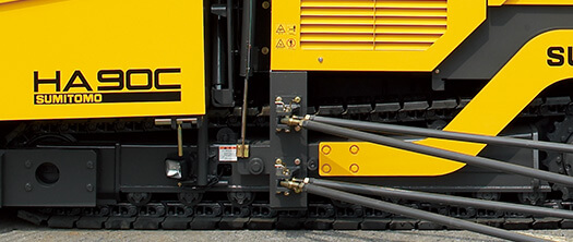 以往的攤鋪機(jī)在與裝卸車接車時(shí),會(huì)出現(xiàn)被推動(dòng)而向后退的現(xiàn)象,造成新鋪路面損傷或路面留有熨平板痕跡。HA90C攤鋪機(jī)具有即使?fàn)恳嚭笸?熨平板也不會(huì)同時(shí)后退的結(jié)構(gòu)。